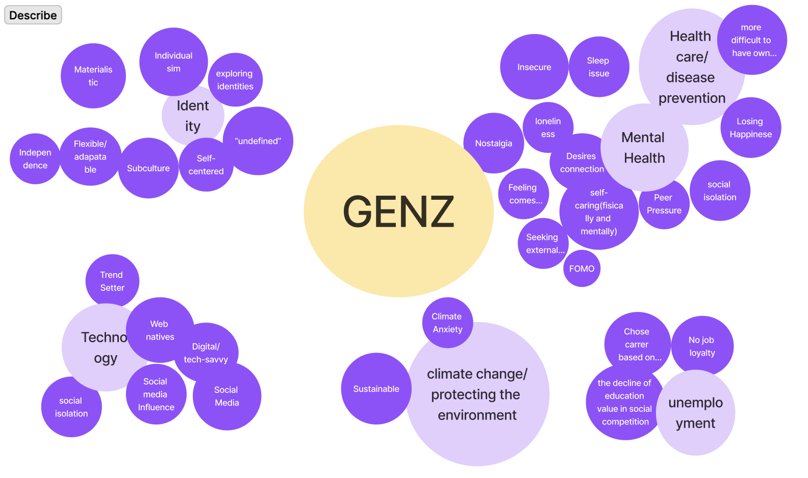 In order to get the first impression of the problem space, we used brainstorming and affinity mapping to describe Generation Z. Meanwhile, we carried out intensive desktop research around different topics, including mental health, identity, unemployment, technology, and climate change.